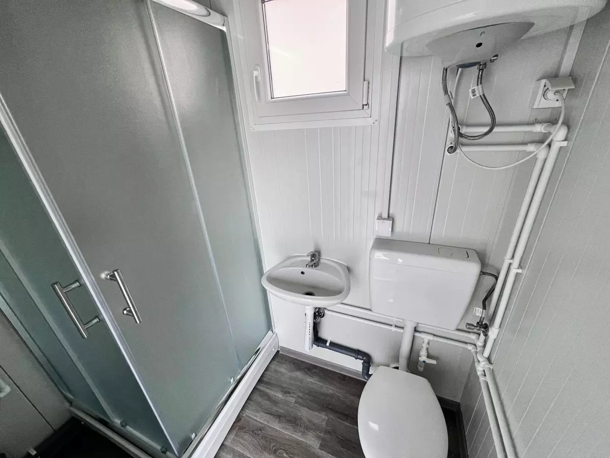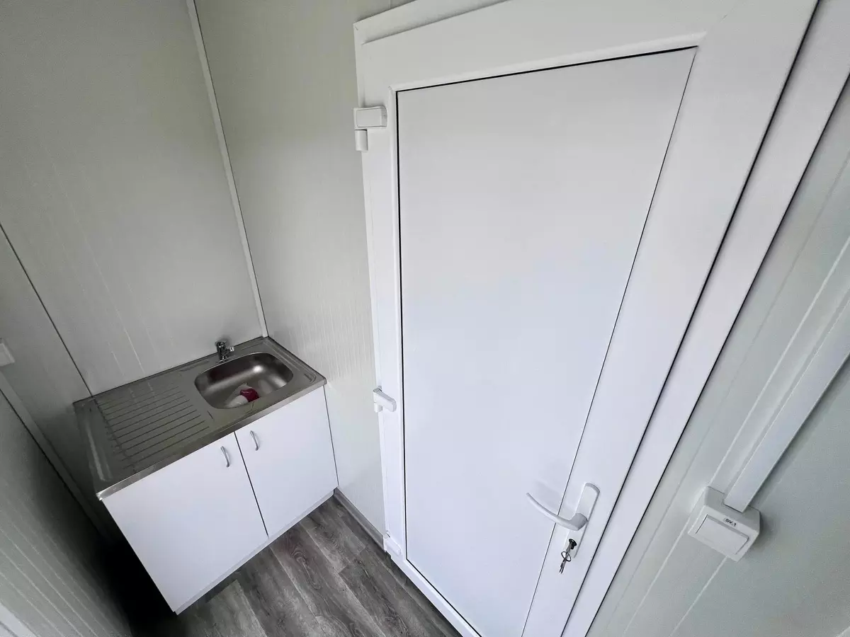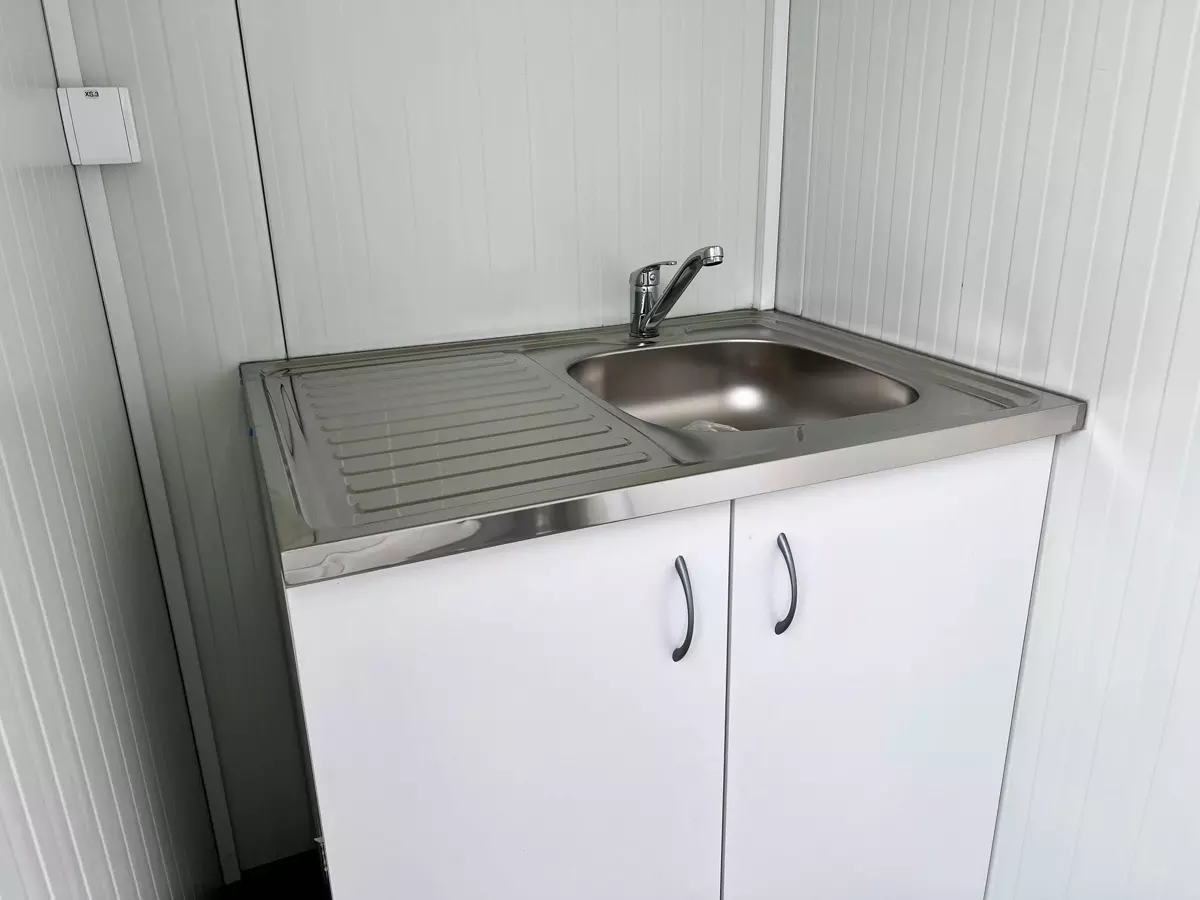 Obytný kontajner má plne vybavenú sanitárnu miestnosť a navyše vstupnú miestnosť s malou kuchyňou.